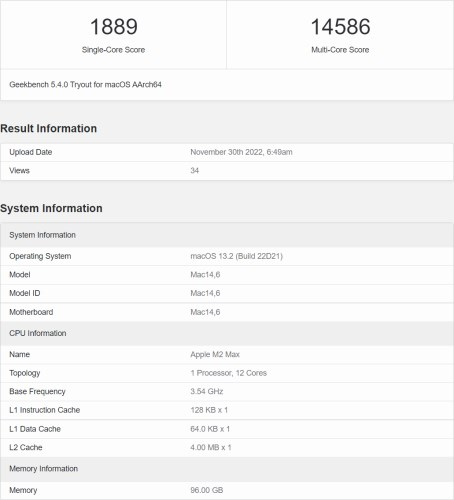 Performans söz konusu olduğunda, Apple M2 Max CPU, tek çekirdekte 1889 puan ve çok çekirdekli testlerde ise 14586 puan almayı başarmış. Karşılaştırma için, Apple M1 Max, tek çekirdekte yaklaşık 1750 puan ve çok çekirdekli testlerde 12.200 puan alıyor. Bu da bize önceki nesle göre %10’a varan tek çekirdek ve %20 çoklu çekirdek performans artışı sağlıyor